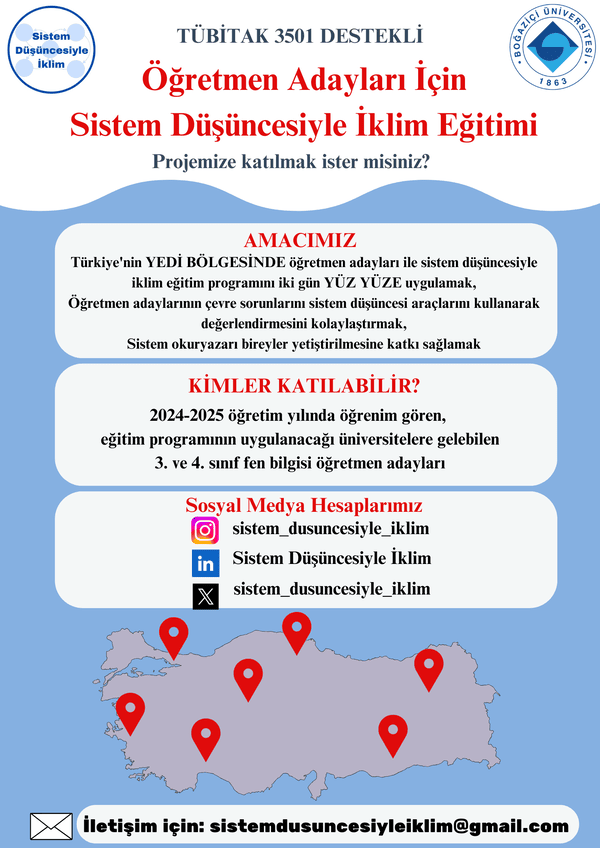 - Öğretmen adaylarının sistem düşüncesi yaklaşımını kullanarak iklim krizini analiz etme, sistemik etkilerini anlama ve sürdürülebilir çözümler geliştirme becerilerini derinleştirmelerine odaklanan online bir eğitim programı planlanmıştır.